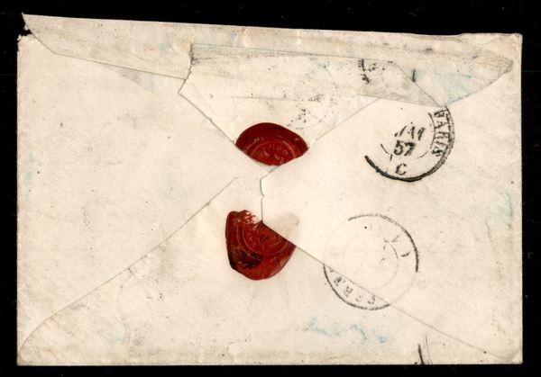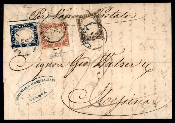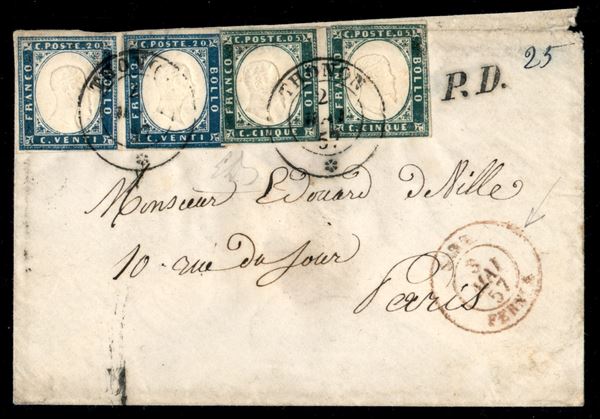 Insieme di due lettere con belle affrancature di cui una tricolore da Genova 12 NOV 58 per Messina (cert. Raybaudi Luigi) e una bicolore da Thonon 2 MAI 57 (Alta Savoia) per Parigi