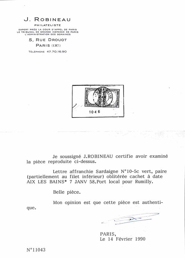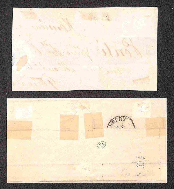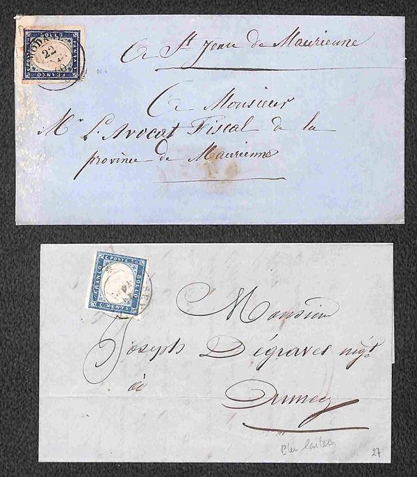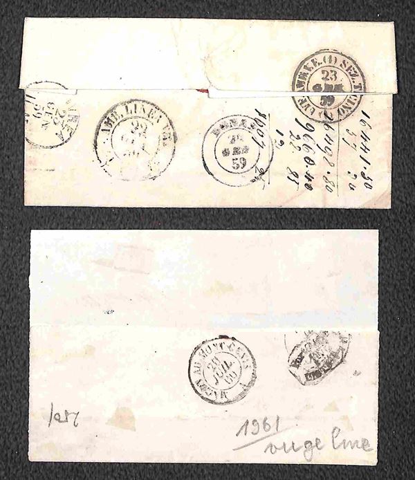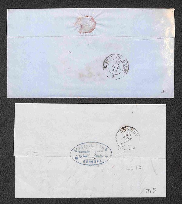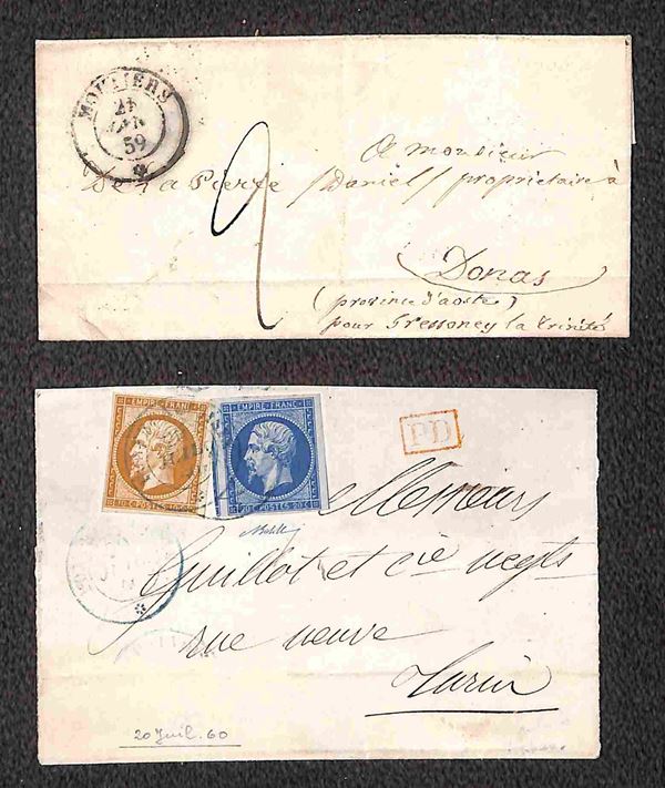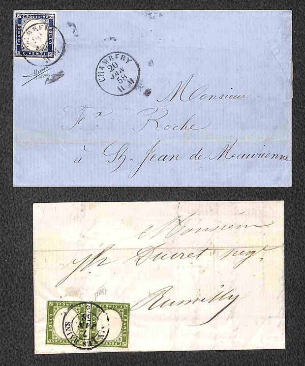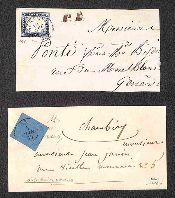 Insieme di otto oggetti postali con annulli di Savoia su Sardegna e Francia fra cui un frontespizio e una lettera non affrancata - presenza di un certificato - merita esame