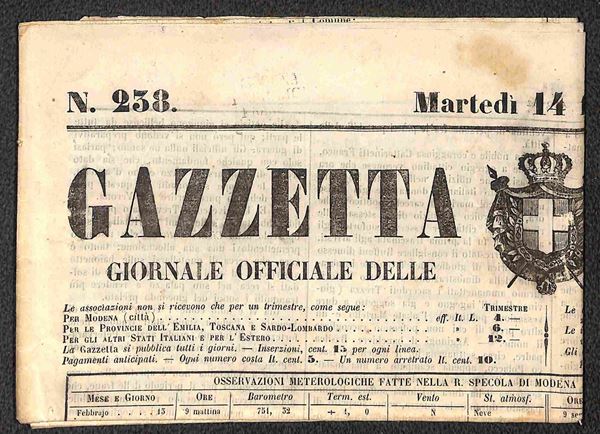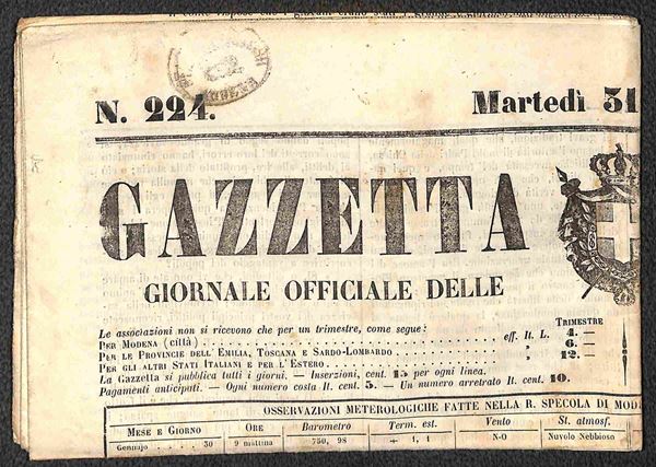Insieme di tre giornali con bolli "Modena periodici franchi" e "Modena stampati franchi"