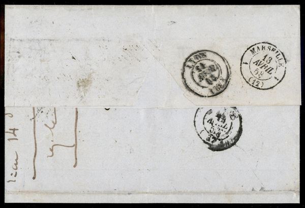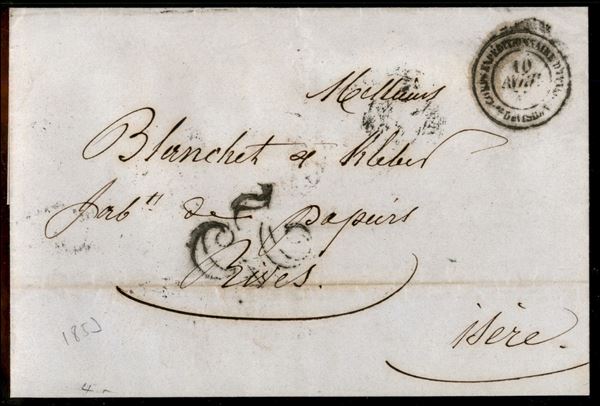 Involucro di lettera da Roma per Rives (Isere) con bollo Corps Expeditionnaire d'Italie 1e Division 10 AVRIL.53 e tassa a tampone25 da pagarsi a destino - al verso transiti di Marsiglia e Lione - bollo di arrivo a Rives in data 15 aprile