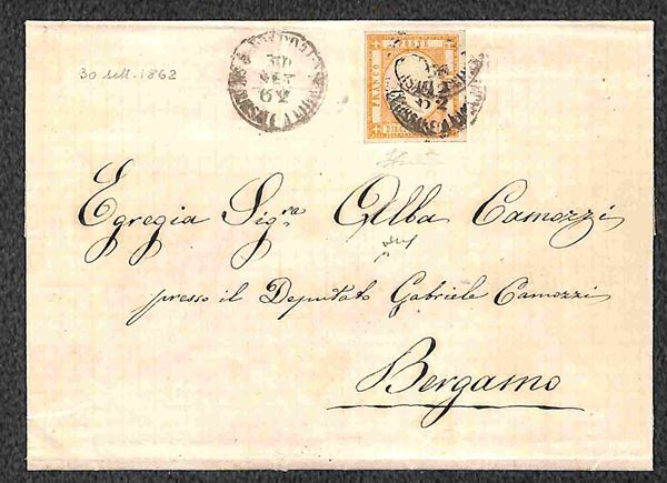 Lettera affrancata con 10 grana arancio (22) - ottimi margini - da Napoli 30 SET 62 a Bergamo - rara lettera risalente all'ultimo giorno di validità ufficiale dei francobolli delle Province Napoletane - ottimo aspetto - grande rarità di storia postale