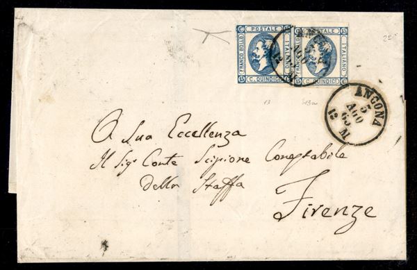 Lettera affrancata con 15 cent litografico azzurro (13 varietà) con doppia stampa da slittamento (angolo superiore sinistro) + 15 cent litografico azzurro chiaro (13a) da Ancona 5 AGO 63 per Firenze - cert. Bottacchi