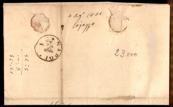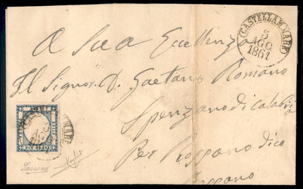 Lettera affrancata con 2 grana azzurro scuro da Castellammare 5 AGO.1861 (20d + P.ti 7 cat.675) per Roppano - firme Raybaudi + Sassone