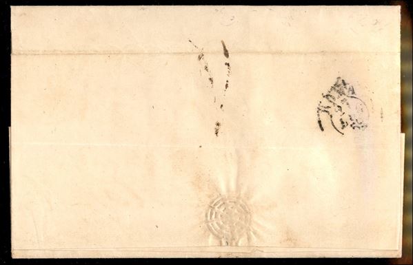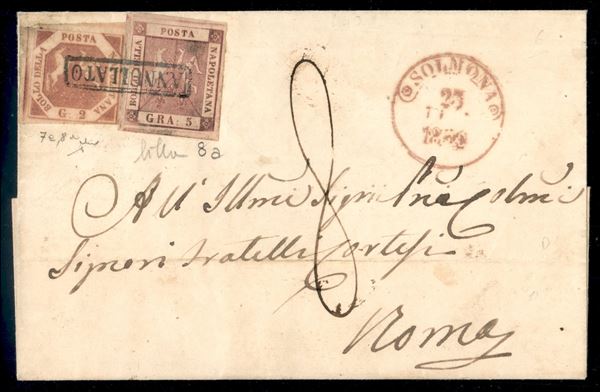Lettera affrancata con 2 grana carminio vivo III tavola + 5 grana rosa lillaceo (7e + 8a) da Sulmona 25 LUG.1859 per Roma con tassa 8 bajocchi per l'inoltro a destino