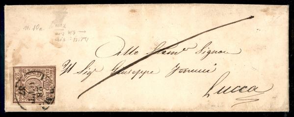 Lettera affrancata con 25 cent bruno lilla III emissione (10 cat.1375) - minimi difetti - da parma 28 OTT 57 per Lucca