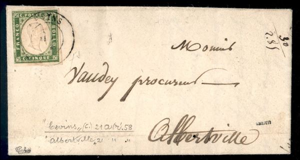 Lettera affrancata con 5 cent verde giallo (13Ag) da Cevins 21AVR.58 per Albertville - raro annullo su letterina in distretto