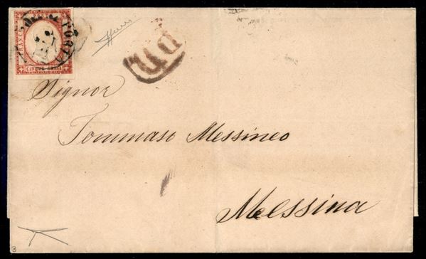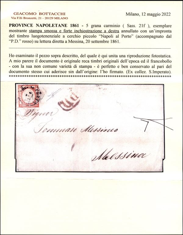 Lettera affrancata con 5 grana carminio (21f) con stampa smossa e forte inchiostrazione a destra - da Napoli al Porto 20 SET.61 per Messina con a lato Bollo in cartella P.D. - cert. Bottacchi