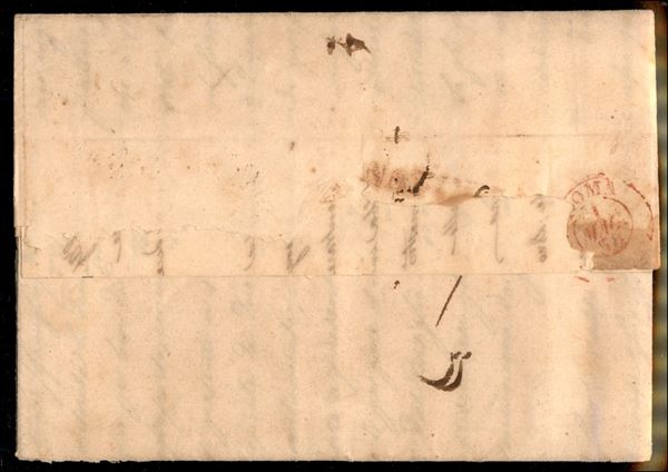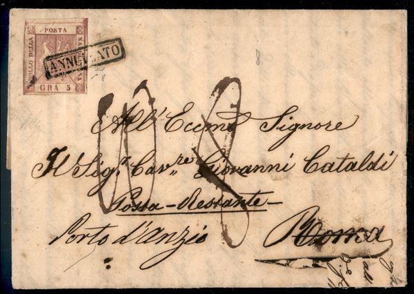 Lettera affrancata con 5 grana rosa brunastro I tavola (8) da Napoli 29 APR.1858 diretta a Roma e tassata 8 bajocchi qui rispedita a porto d'Anzio e tassa corretta da 8 a 10 bajocchi - interessante