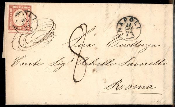 Lettera affrancata con 5 grana rosso carminio (21) da Napoli 22 MAR 62 per Roma tassa 8 manoscritta