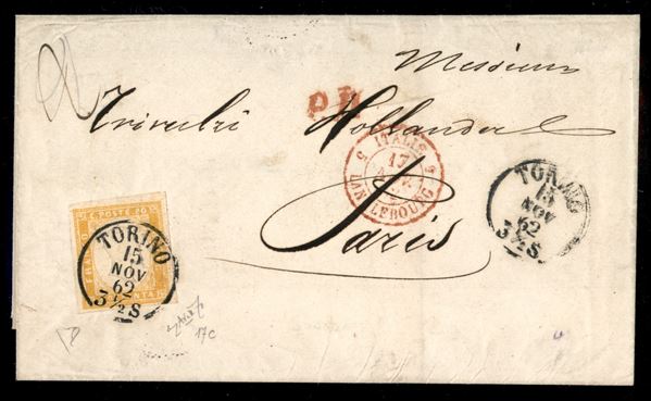 Lettera affrancata con 80 cent giallo arancio (17C cat.6375) isolato da Torino 15 NOV 62 per Parigi - cert. Enzo Diena