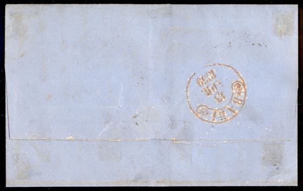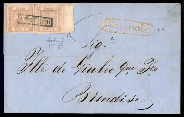 Lettera affrancata con coppia del 1 grana (4) con parte di filigrana sul bordo laterale destro - Cirignola 12.4.59 - completa il lotto esemplare di 1 grano con difetti