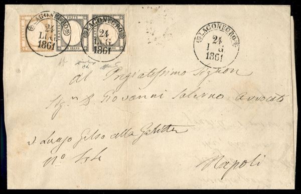Lettera affrancata con coppia orizzontale del 1 grano grigio nero con filetto di inquadratura in alto + 10 grana bistro da Lagonegro 24 LUG.1861 per Napoli - varietà molto rara e probabilmente unica nota in coppia - firme AD + Chiavarello