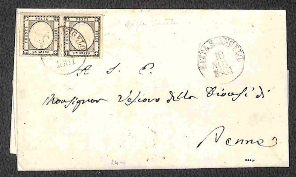 Lettera affrancata con coppia orizzontale del 1 grano nero (19 cat.400) da Cittą S.Angelo 10 NOV.1861 per Penne