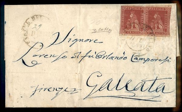 Lettera affrancata con coppia orizzontale del 1 crazia (12) con grandi margini da Castel del rio 29 DIC 1860 per Galeata - ultimi giorni d'uso - qualità eccezionale