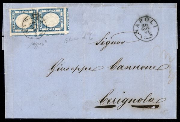Lettera affrancata con coppia verticale del 2 grana azzurro chiaro (20) eccezionale per ampiezza dei margini da Napoli 26 NOV 61 per Cerignola - qualità lusso - firma Caffaz