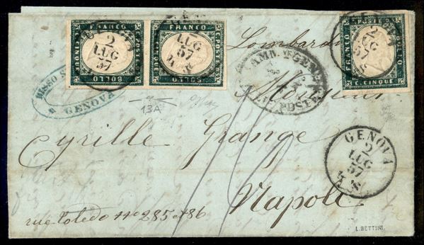 Lettera affrancata con coppia verticale + singolo del 5 cent verde mirto (13A) - margini perfetti - da Genova 2 LUG 57 per Napoli con il vapore "Lombardo" - firma Oliva + cert. Manzoni
