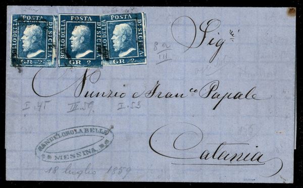 Lettera affrancata con due esemplari del 2 grana azzurro Pos. 45 e 59 della I tavola + 2 grana azzurro scurissimo Pos. 59 della III tavola (6 + 8a) da Messina 18 luglio 1859 per Catania