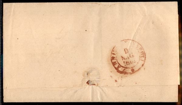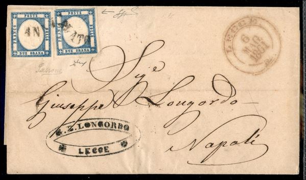 Lettera affrancata con due esemplari del 2 grana azzurro chiaro di cui uno con filetto di inquadratura in alto (20 + 20k cat.3300+) annullati con bollo a svolazzo (p.ti 9) da Lecce 6 MAG.1861 per Napoli - firme Chiavarello + Sassone