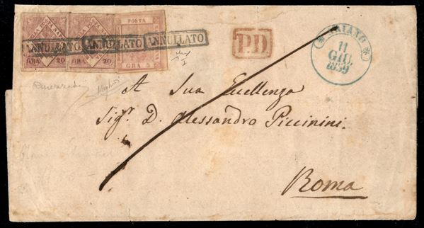 Lettera affrancata con due esemplari del 20 grana rosa lillaceo I tavola + 5 grana II tavola (9 + 12a cat.14050) da Ariano 11 GIU.1859 per Roma - firma Chiavarello + cert. Raybaudi