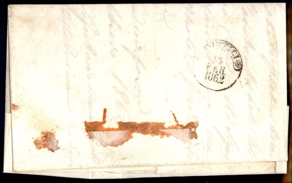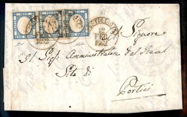 Lettera affrancata con striscia orizzontale di tre esemplari del 2 grana azzurro chiaro (20 cat.2200) da Postiglione 12 FEB.1862 per portici - firme AD + Chiavarello + Oliva