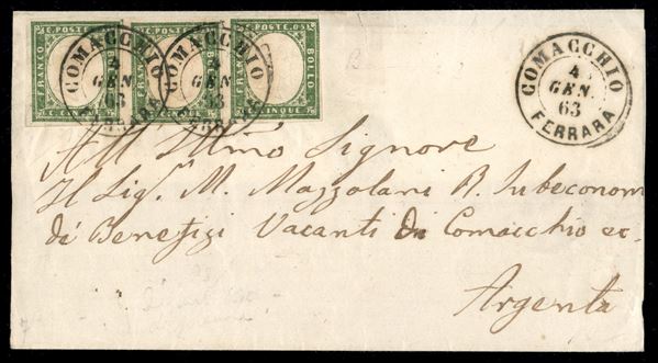 Lettera affrancata con striscia orizzontale di tre del 5 cent verde giallastro (13Da) da Comacchio Ferrara 4 GEN.63 per Argenta