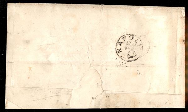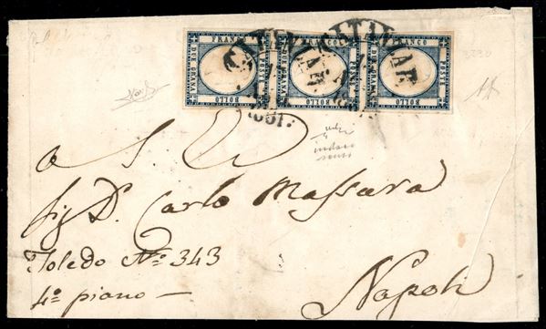 Lettera affrancata con striscia verticale di tre esemplari del 2 grana indaco (20e) da Catanzaro 13 AGO.1861 per Napoli - raro multiplo - firme Raybaudi + Chiavarello