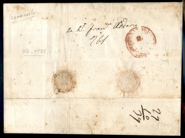 Lettera assicurata con striscia verticale di quattro a seggiola del 1/2 grano II tavola + coppia 5 grana II tavola (4+9) annullati con Svolazzo da Trani 31 DIC.1860 per Napoli - firma R.Mondolfo - rara e di ottima qualità