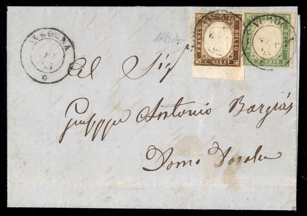 Lettera con affrancatura mista composta da Sardegna 5 cent verde giallo (13Ad) in uso tardivo + Regno 10 cent bruno scuro (1k) non dentellato in basso - da Vogogna 6 GEN.63 per Domodossola - cert. Alberto Diena
