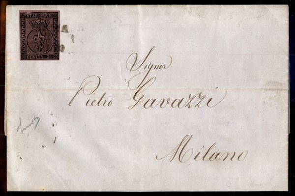 Lettera da PARMA 2 LUGLIO del 1853 per Milano affrancata con 25 cent violetto (4 cat. 1.650) - esemplare con buoni margini che presenta una bella varietà di stampa all'angolo superiore sinistro