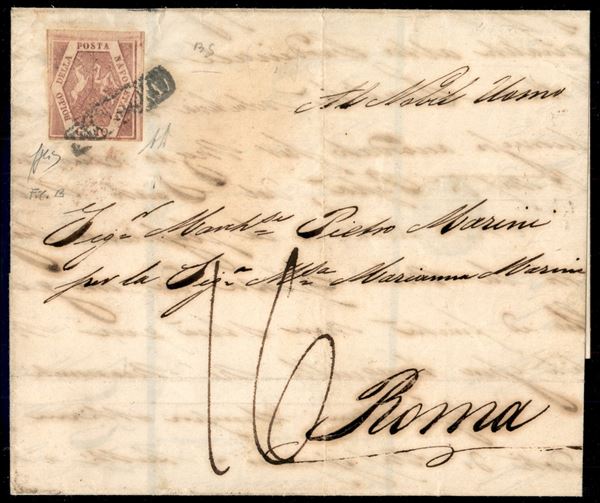 Lettera di doppio porto da Napoli 28 GIU.1860 affrancata con 10 grana lilla rosa I tavola (10a) per Roma - tassata 16 bajocchi per il percorso pontificio