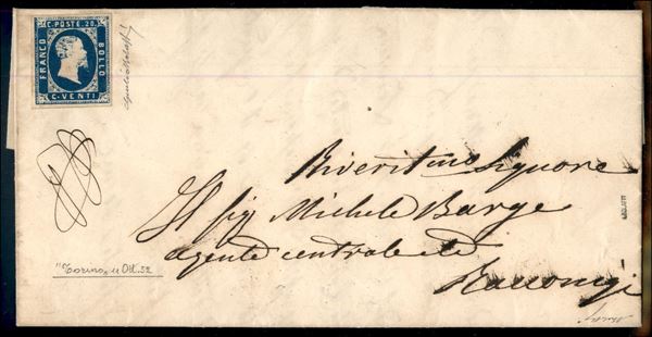 Lettera in corso particolare recapitata a mano affrancata con 20 cent azzurro - francobollo con ottimi margini non annullato con manoscritto a lato "P.P." - firma per esteso Giulio Bolaffi - prezzo calcolato come francobollo nuovo senza gomma (2 cat.7000)