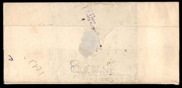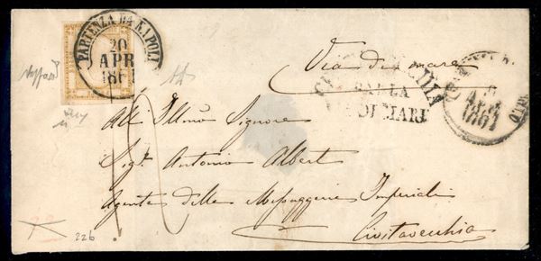 Lettera per Civitavecchia viaggiata per via di mare affrancata con 10 grana bistro oliva (22b cat.4750) annullato Partenza da Napoli 20 APR.1861 - firme Caffaz + AD + Chiavarello