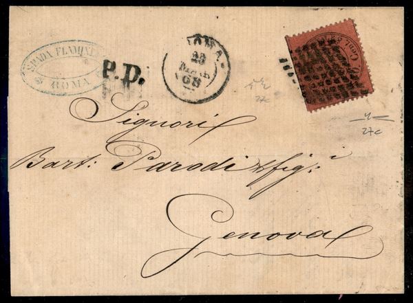 Lettera per Genova affrancata con 20 cent rosso bruno (27c cat.3000) annullato a losanga di rombi da Roma 28 MAG.68 - firma Chiavarello + cert. Manzoni