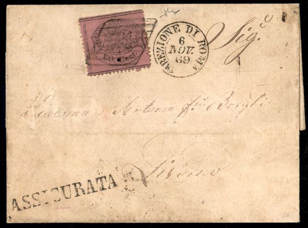Lettera per Livorno affrancata con 80 cent rosa chiaro isolato (30 cat.7500) - francobollo annullato a griglia con a lato bollo doppio cerchio Direzione di Roma 6 NOV.69 e lineare ASSICURATA - non comune - firma Chiavarello