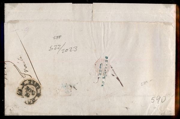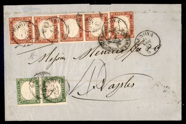 Lettera tre porti affrancata con striscia orizzontale di cinque 40 cent Vermiglio arancio chiaro posizioni 11-15 compresa la posizione 12 con i quattro filetti di inquadratura + coppia orizzontale del 5 cent verde giallo (13Ad + 16Ab cat.16000+) viaggiata via di mare da Genova 6 NOV.57 per Napoli con segno di tassa - firma AD