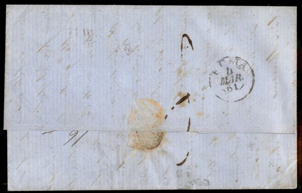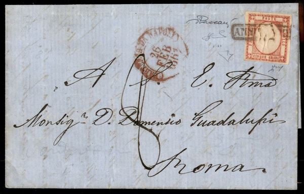 Napoli annullato brunastro + cerchio rosso (p.ti 12) su 5 grana (21a) - perfetto - su sovracoperta di lettera del 26 FEB.1861 per Roma - tassata 8 bajocchi - primo mese d'uso - molto bella - firme ED + Vaccari + Chiavarello