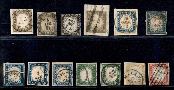 Quarta emissione - Lotto di valori usati con alcune tinte interessanti varietà ed annulli incluso un blocco nuovo del 80 cent arancio e due coppie verticali di marche per passaporti - interessante