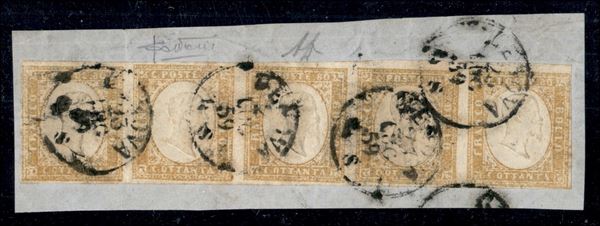 Striscia orizzontale di cinque 80 cent giallo ocra pallido (17A) annullo Genova 23 LUG 59 su frammento - molto rara e perfetta - cert. Alberto Diena