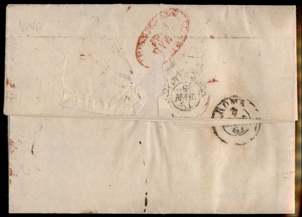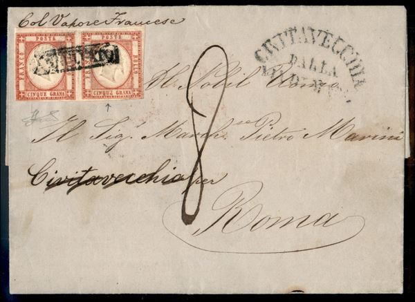 Ufficio Postale Porto di Napoli ovale in rosso (p.ti 12) - coppia orizzontale del 5 grana (21) - perfetta - su lettera del 5.3.1861 per Roma - tassata 8 bajocchi - rara