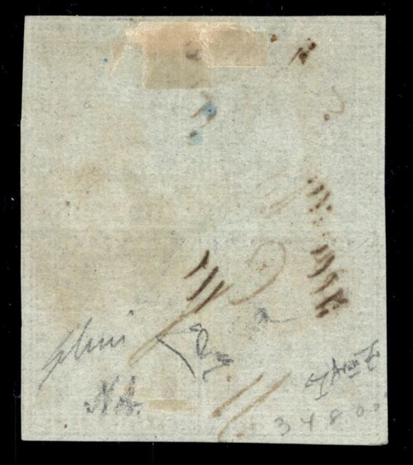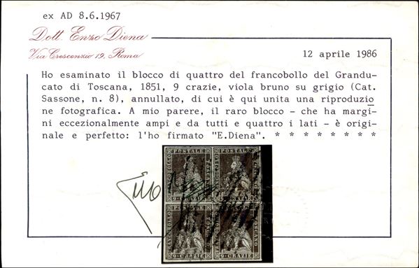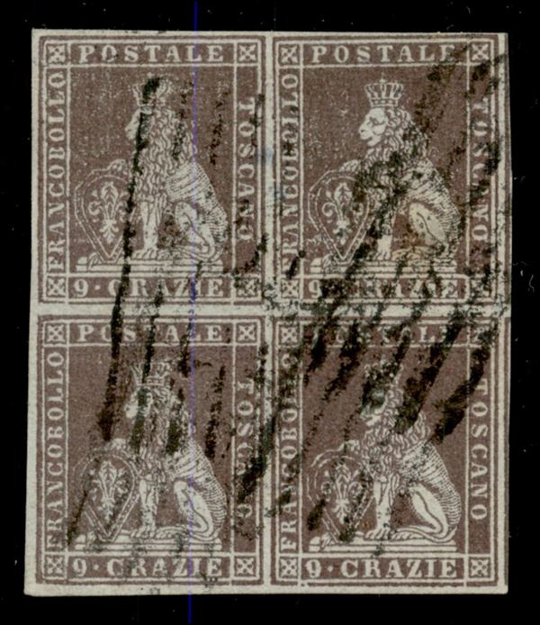 1851 - 9 crazie Marzocco viola bruno su grigio in quartina (8 cat.22000) - usato con ottimi margini sui quattro lati - cert. Enzo Diena