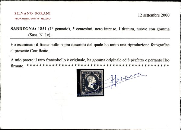 1851 - Prima emissione 5 cent nero intenso di prima tiratura - nuovo con gomma originale - molto fresco e con ottimi margini (1c cat.36000) - Cert. Sorani