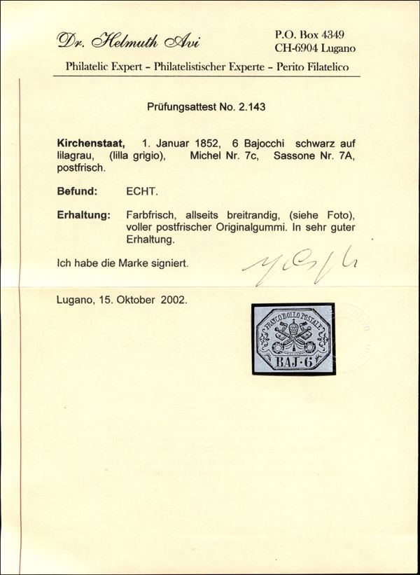1852 - 6 baj (7A) - fresco e bene marginato - gomma integra - cert. Avi
