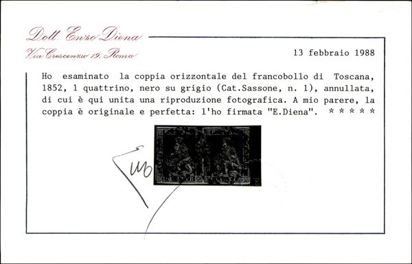 1852 - Coppia del 1 quattrino nero su grigio (1) usata - fresca e ben marginata - cert. Enzo Diena