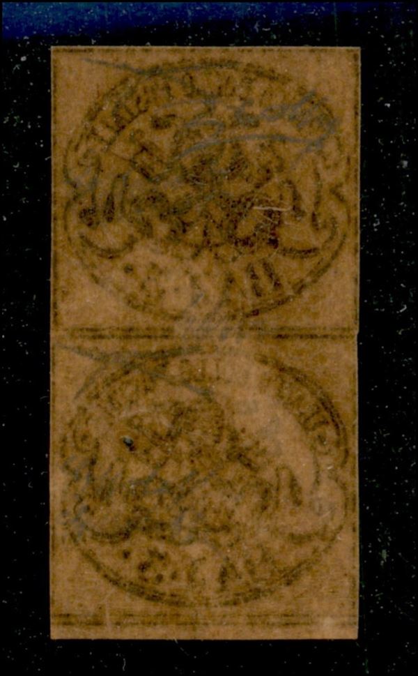 1852 - Coppia verticale del 3 baj bruno cuoio chiaro con stampa oleosa (4Aca) - nuovi con gomma integra - grande rarità - cert. Colla