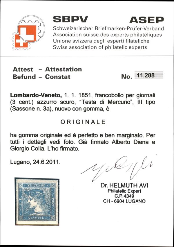 1855 - 3 cent azzurro scuro Francobolli per Giornali Mercurio III tipo (3a cat.2300) - gomma originale con ottimi margini e molto fresco - firma AD + Colla + cert. Avi