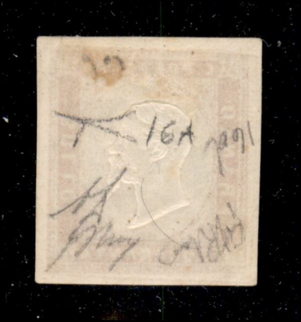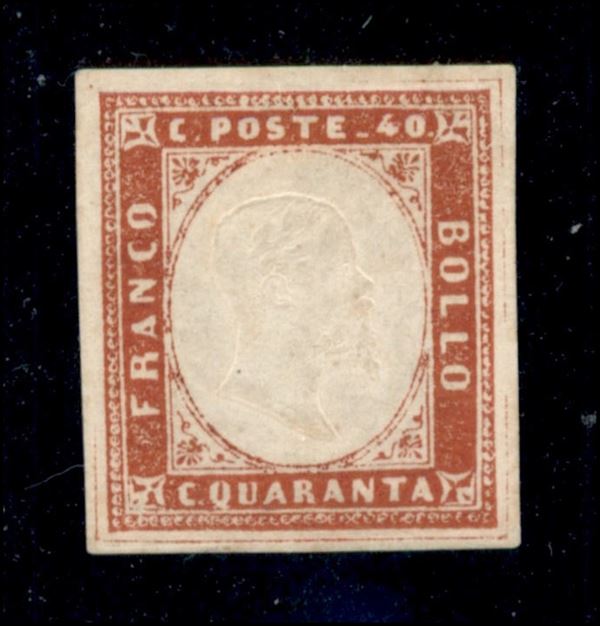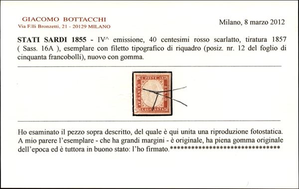 1857 - 40 cent rosso scarlatto (16A cat.7000+) - gomma originale con grandi margini - posizione 12 del foglio - ottima qualità e molto raro - cert. Bottacchi