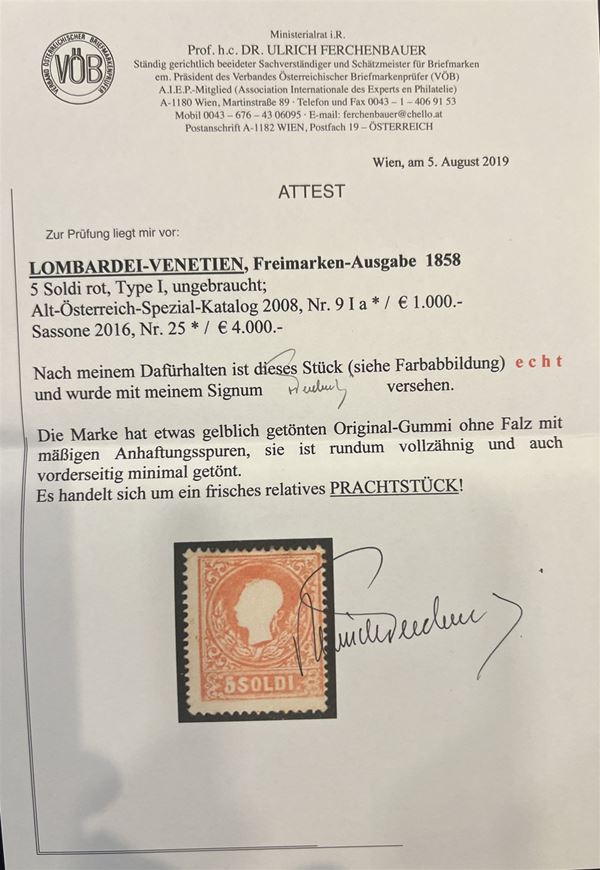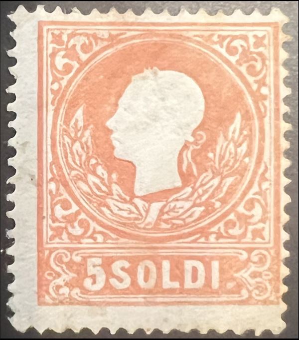 1858 - 5 soldi rosso I tipo (25) - nuovo con gomma originale - splendido - cert. Ferchenbauer