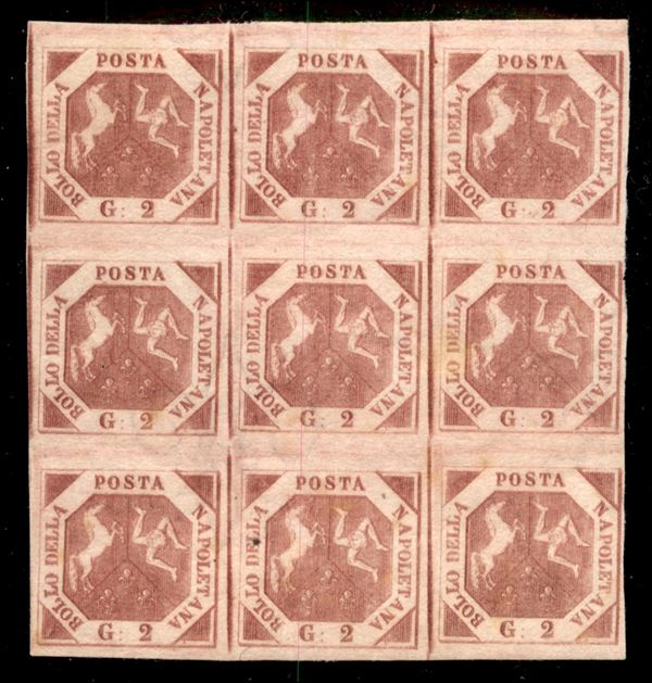 1858 - Blocco di nove esemplari 2 gr. carminio vivo IIIa Tavola (7e cat. 45.000) - raro - fresco di colore e di gomma - perfetto - cert. ED