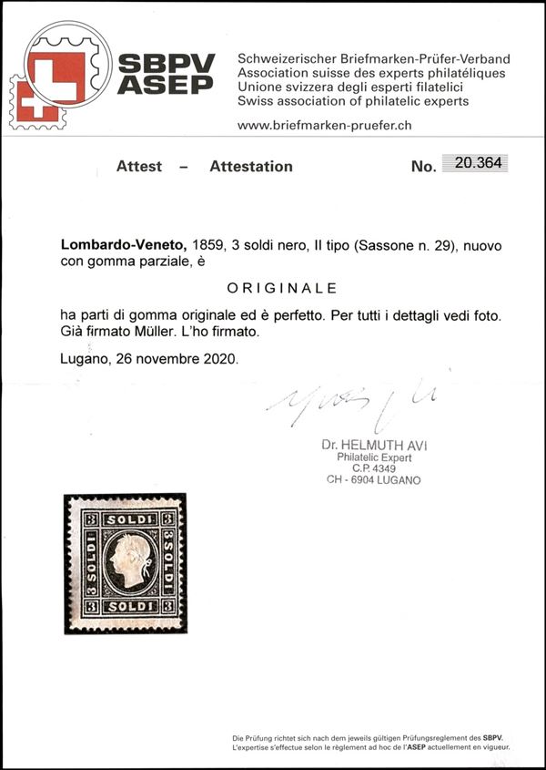 1859 - 3 soldi nero (29) II tipo - gomma originale parziale - cert Avi