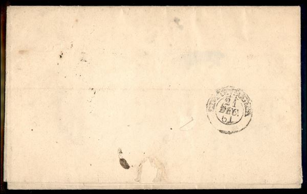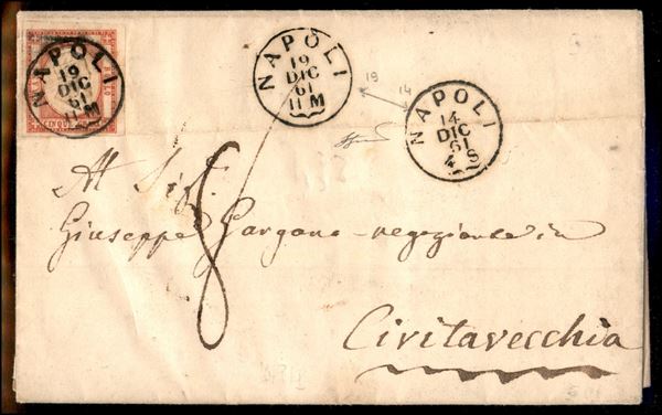 1861 - 5 grana rosso carminio (21) - perfetto - su lettera da Napoli 19 DIC 61 a Civitavecchia - tassata 8 bajocchi - Sul fronte compare anche il datario di Napoli del 14 DIC 61 la lettera venne probabilmente imbucata non affrancata in quella data ma non le venne dato corso in attesa della regolarizzazione da parte del mittente della tariffa richiesta - molto interessante